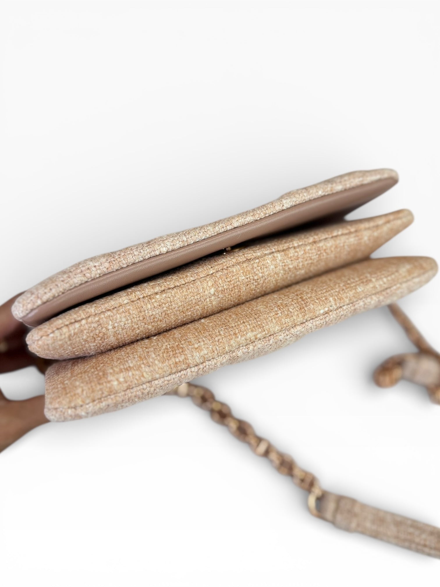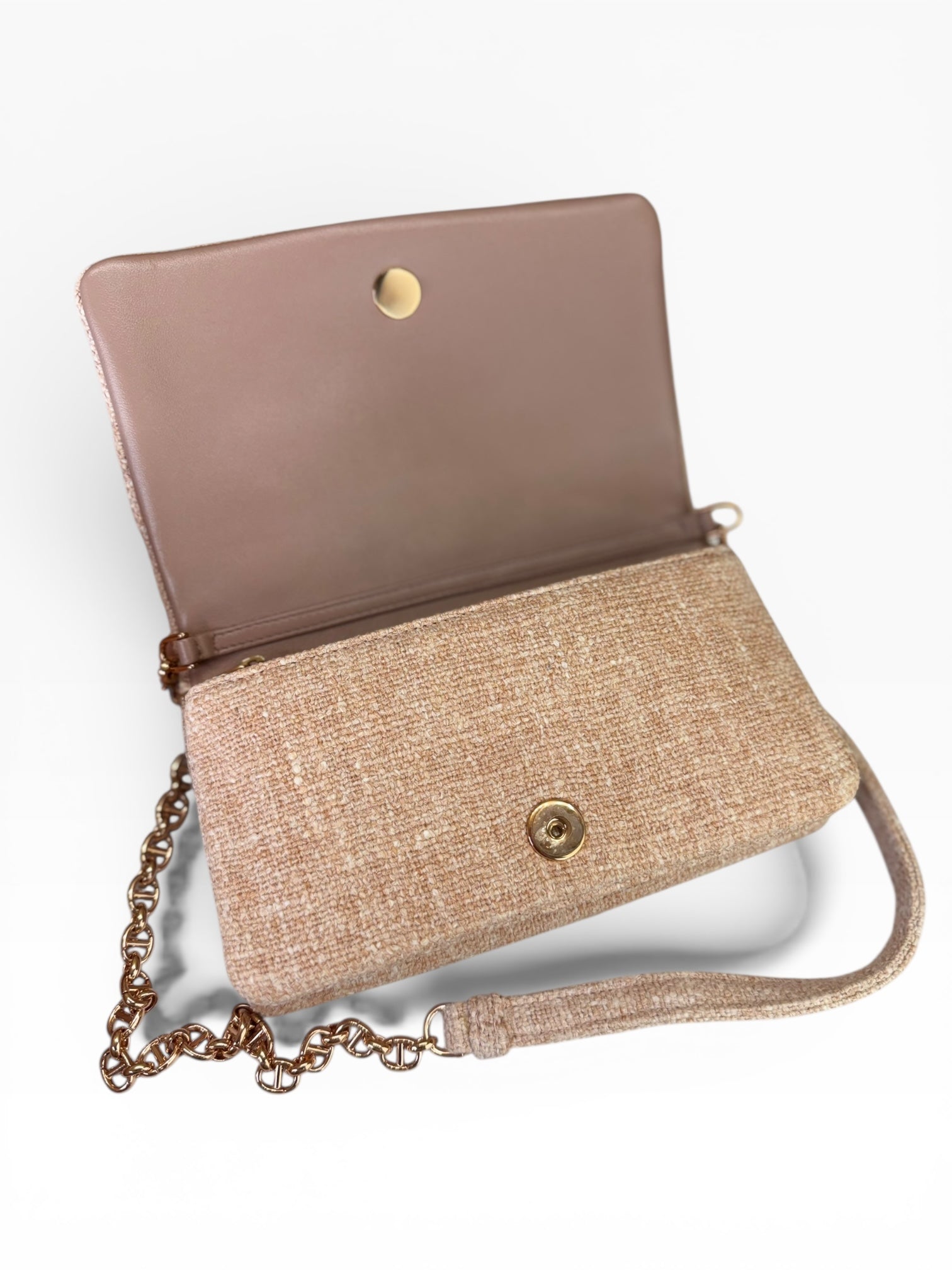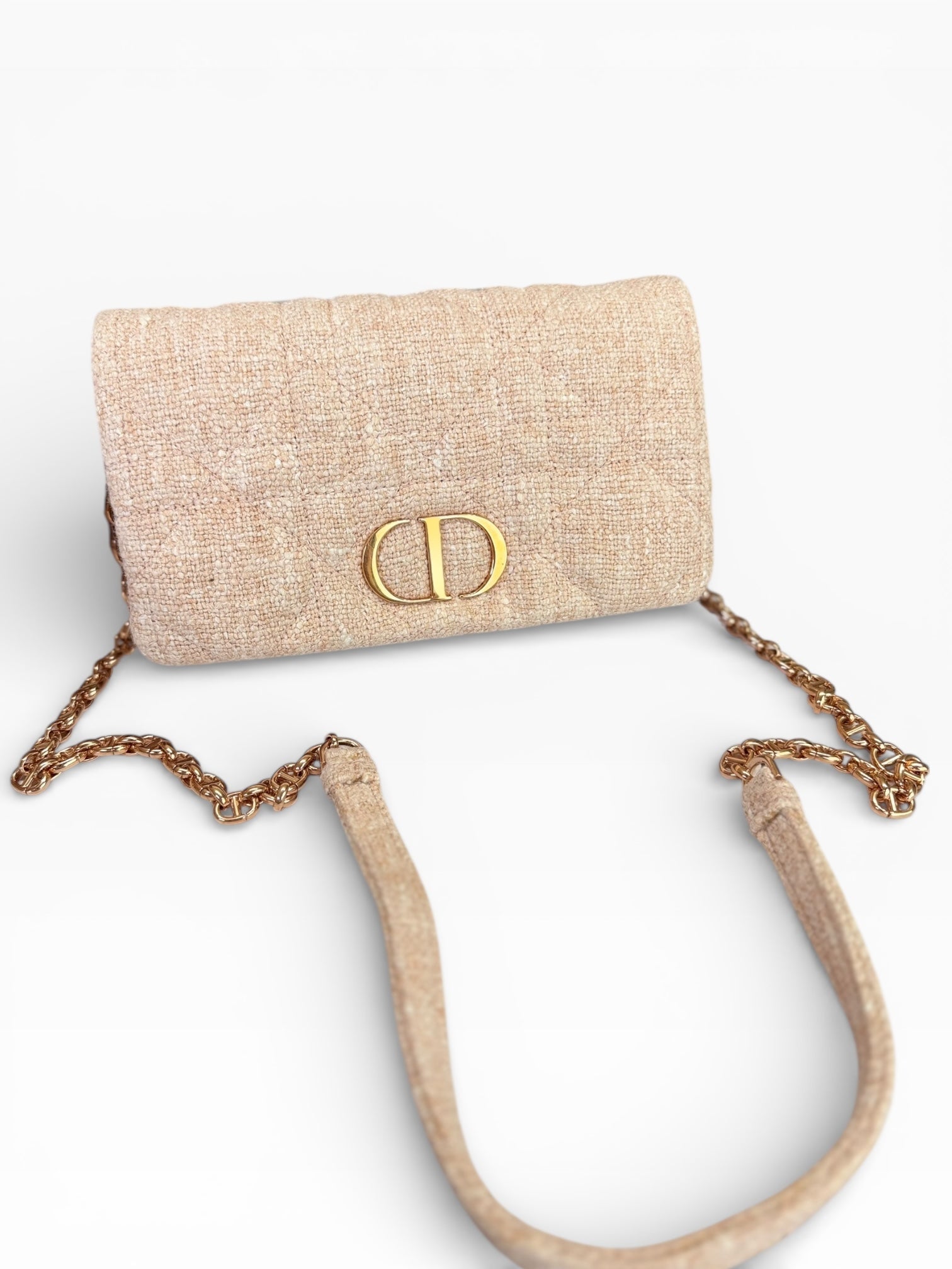Meet the Christian Dior Linen Macrocannage Caro Bag in delightful rose—a bag as fabulous as a unicorn in a tutu! This beauty is quilted linen, perfect for keeping your essentials safe while looking posh. With an adjustable strap to fit your style (or mood), and polished rose gold hardware that’s shinier than your ex’s excuses, you’ll be the talk of the town!
