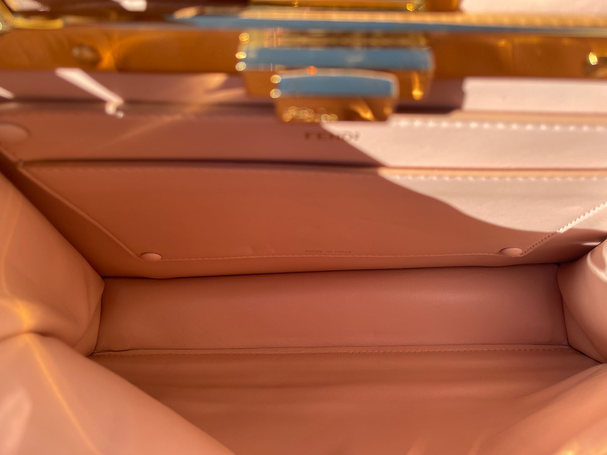 Featuring a suede-lined interior with two internal compartments divided by a stiff partition and a leather internal pocket with gold-colored FENDI logo print.