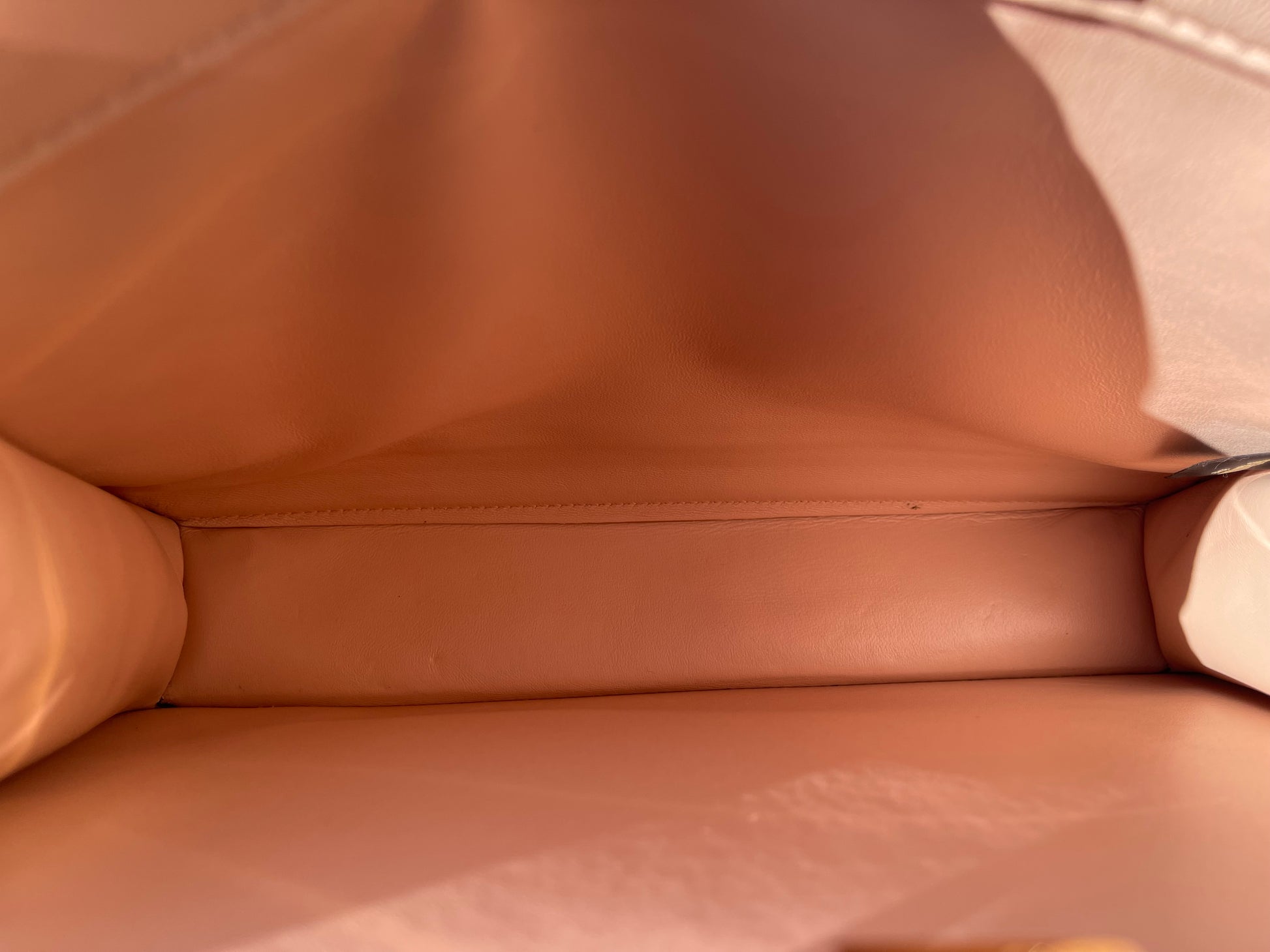 Leather covered aluminum bar to lighten the weight of the bag, gold-finish clasp and metalware.