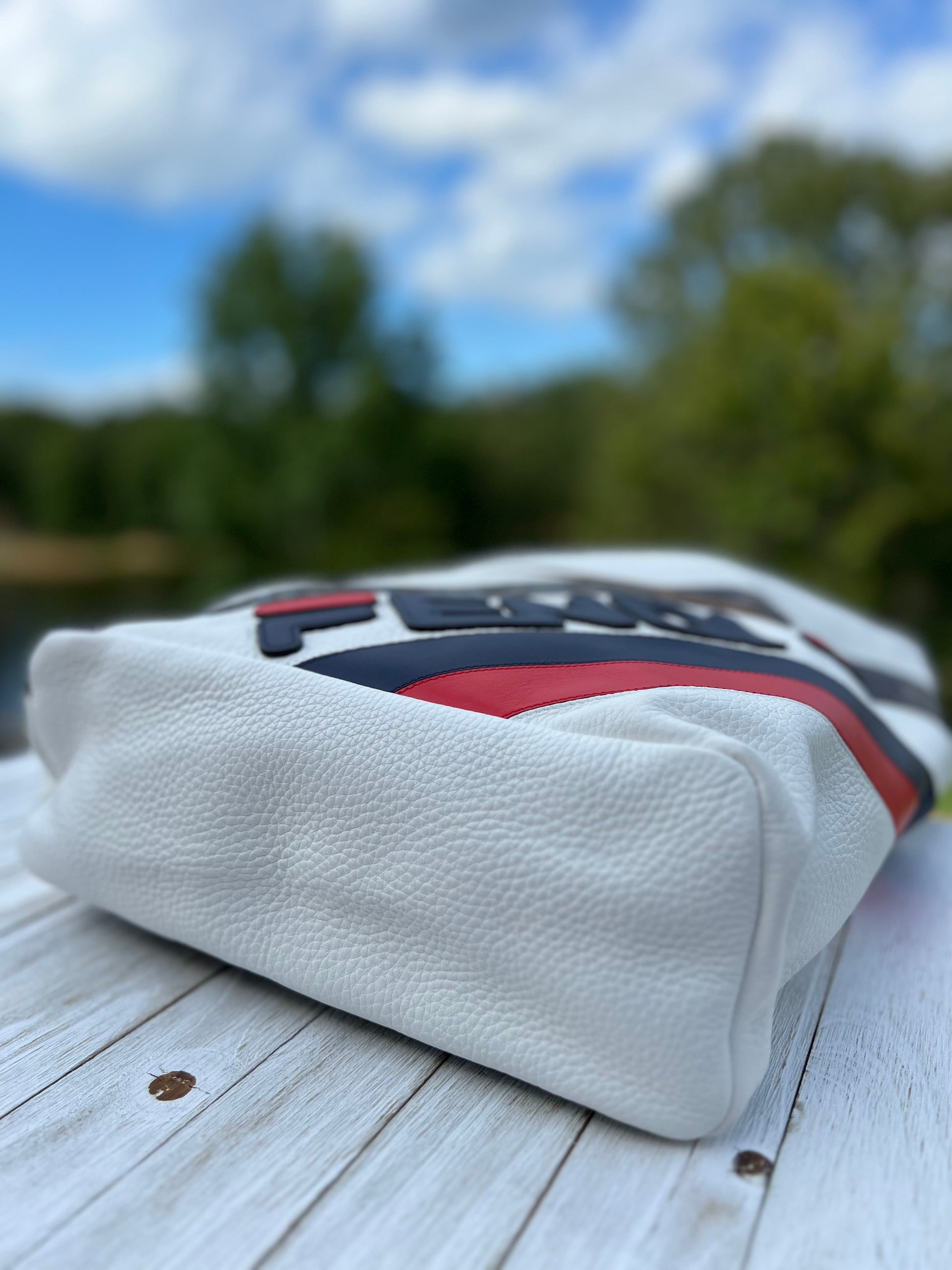 From the bold Fendi Mania capsule, this Fendi x FILA backpack brings streetwear and luxury together in a statement design. Inspired by a custom logo remix by artist @hey_reilly, the bag features a sporty reinterpretation of the iconic Fendi logo using FILA’s classic typeface—blending heritage with hype.