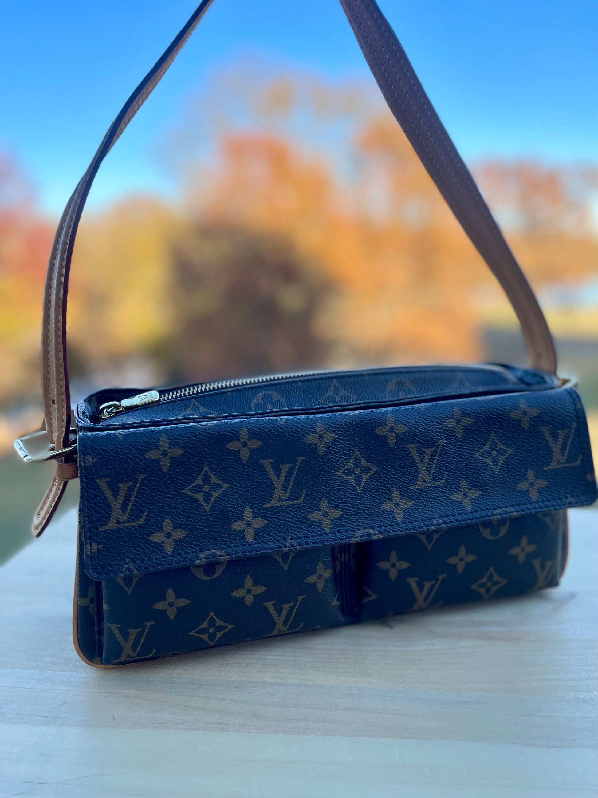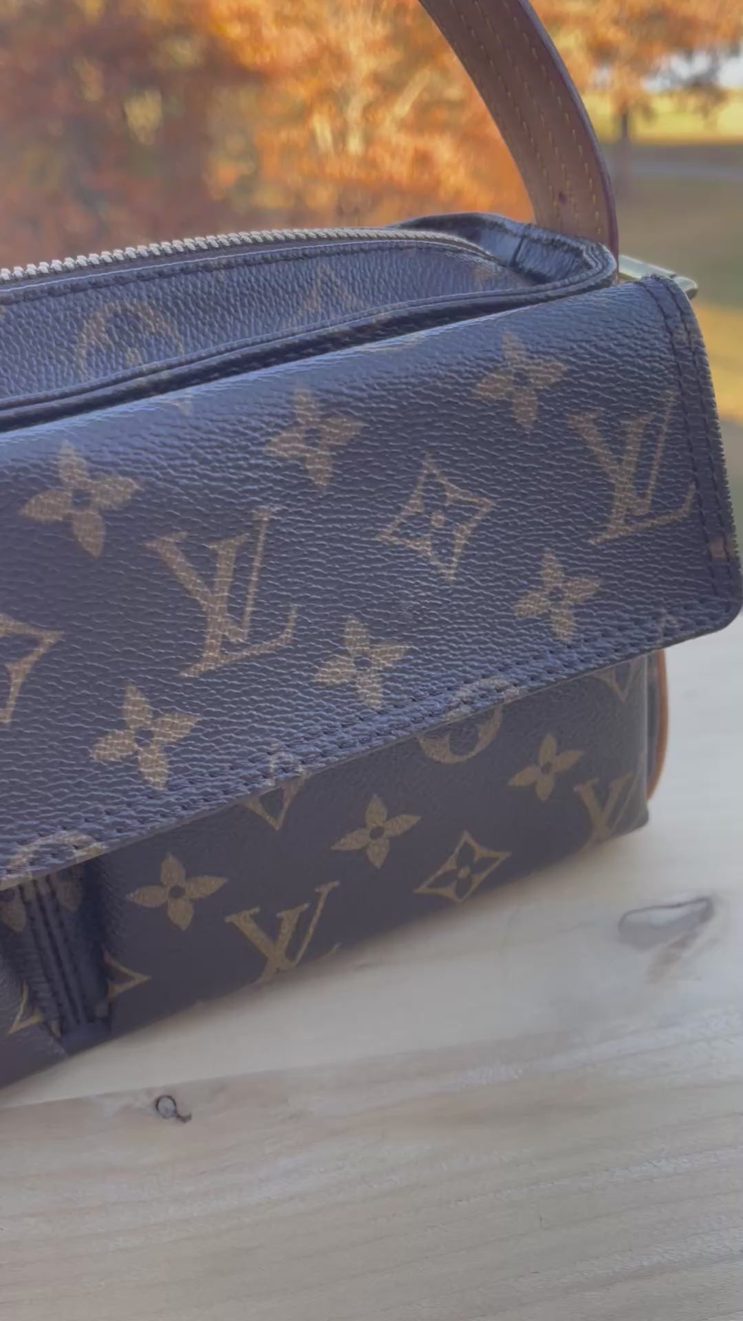 Step out in style with the LOUIS VUITTON Monogram Viva-Cite MM shoulder bag. Crafted from sturdy monogram toile canvas, it boasts two versatile vachetta leather straps and exterior pockets with a frontal flap. The roomy interior in rouge red alcantara fabric includes convenient patch pockets.