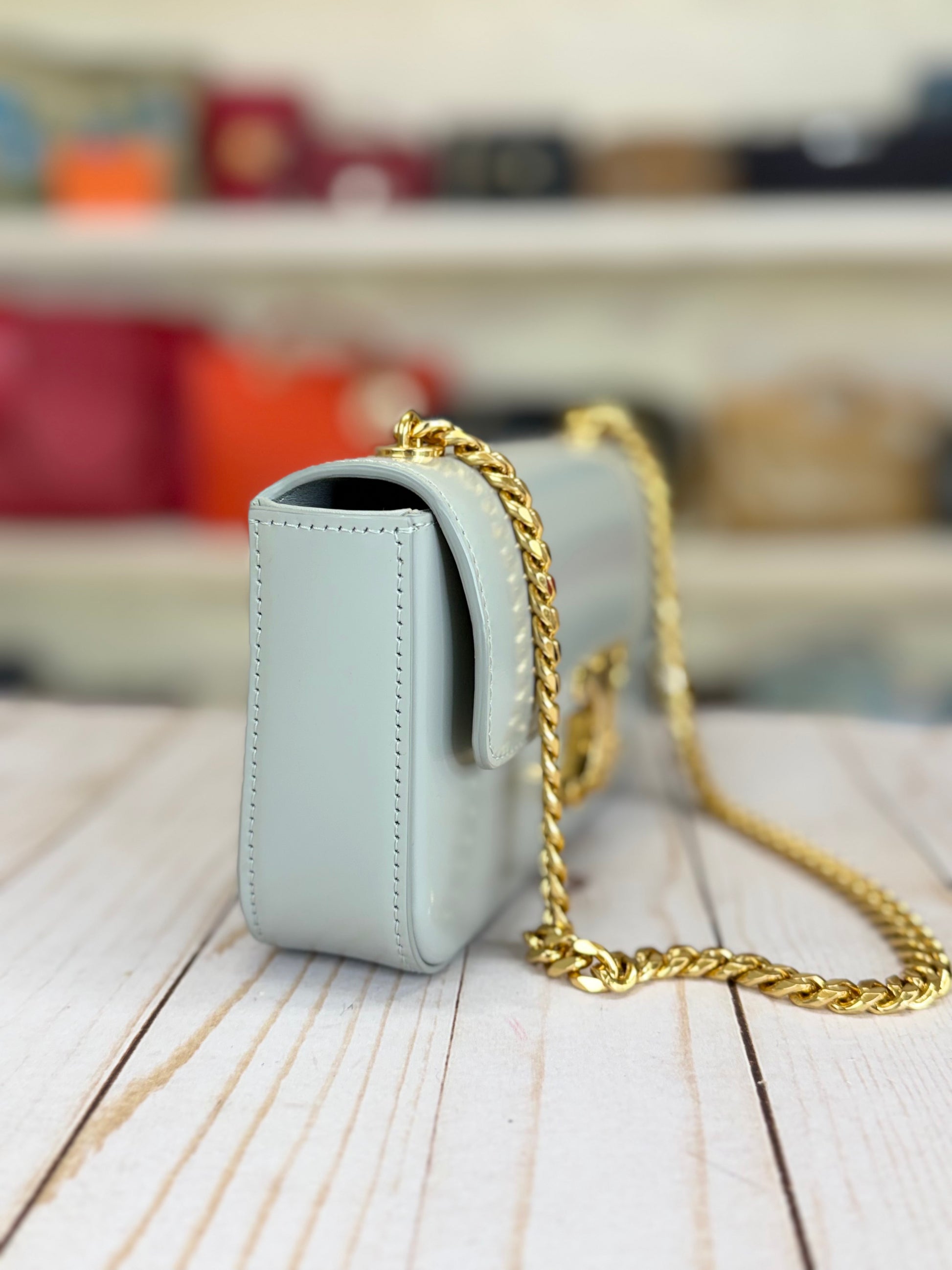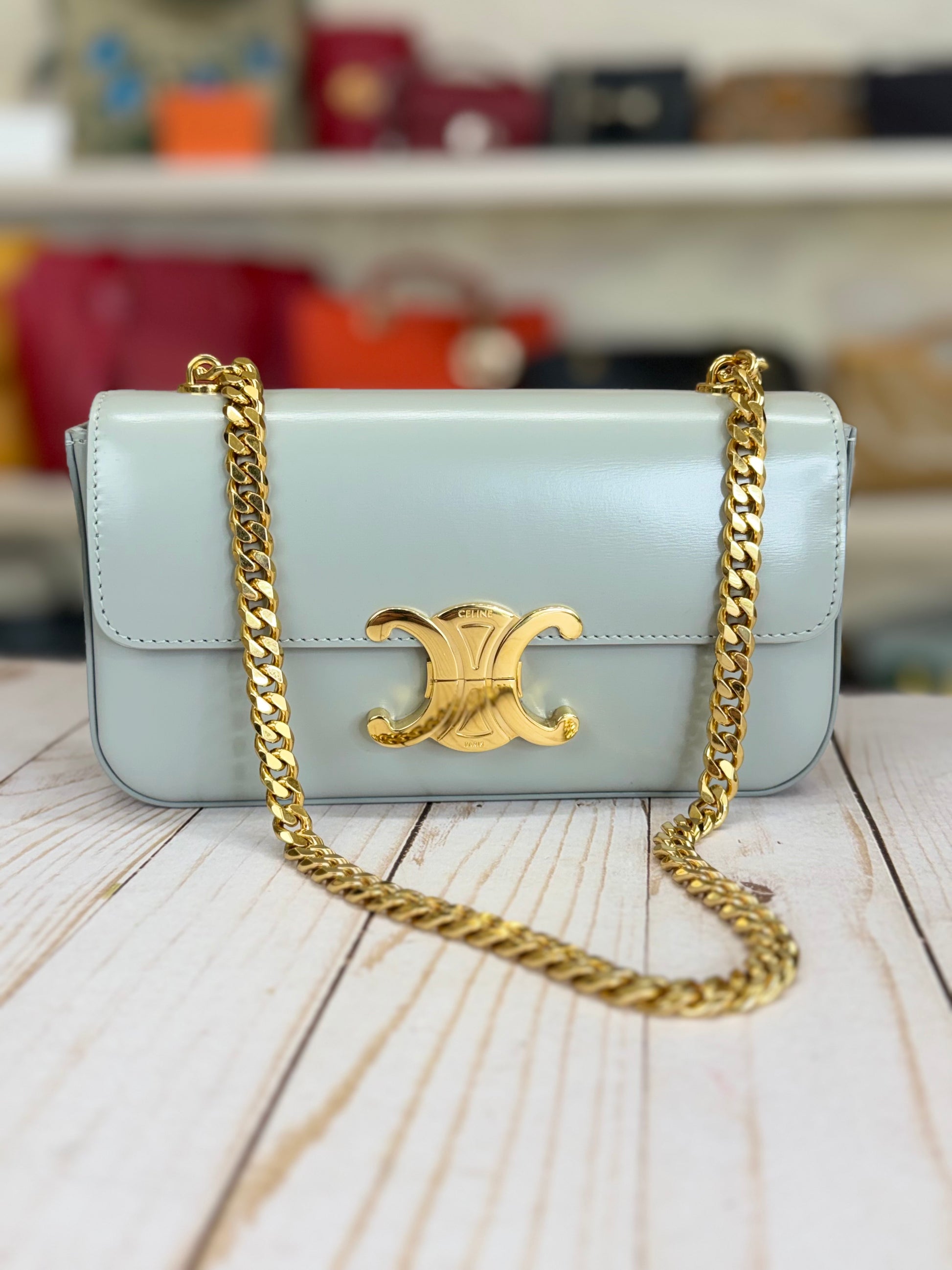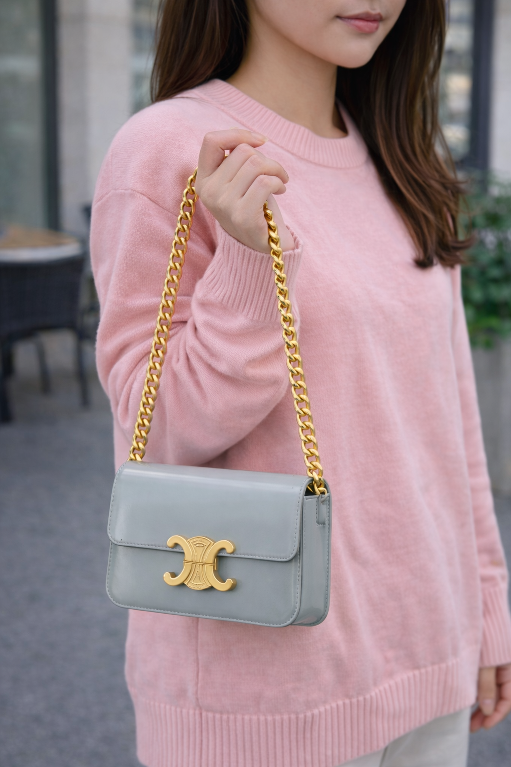 Meet the CELINE Shiny Calfskin Triomphe Chain Shoulder Bag—your new sidekick for any adventure! This snazzy bag is not just easy on the eyes; it’s got space for all your treasures (or snacks, no judgment here). With its gleaming gold hardware and snazzy press lock, it screams “I’ve arrived!” while keeping your goodies secure. Let the shoulder strap adjust to your vibe, and strut like you own the place!